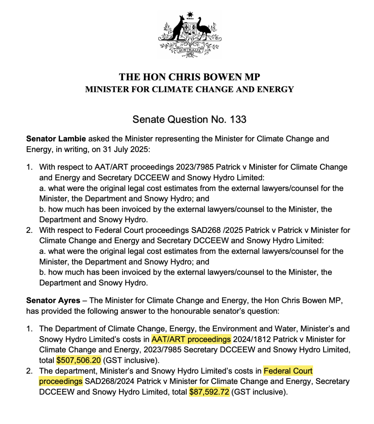 We know from previous answers that Commonwealth’s lawyer’s (the Australian Government Solicitor) costs were sub $100K, which means that Snowy Hydro’s lawyers (King & Wood Mallesons) costs were circa $400K. Same legal fight for both sets of lawyers, very different legal costs. Perhaps this gives us a hint as to why Snowy 2.0 is so over budget.