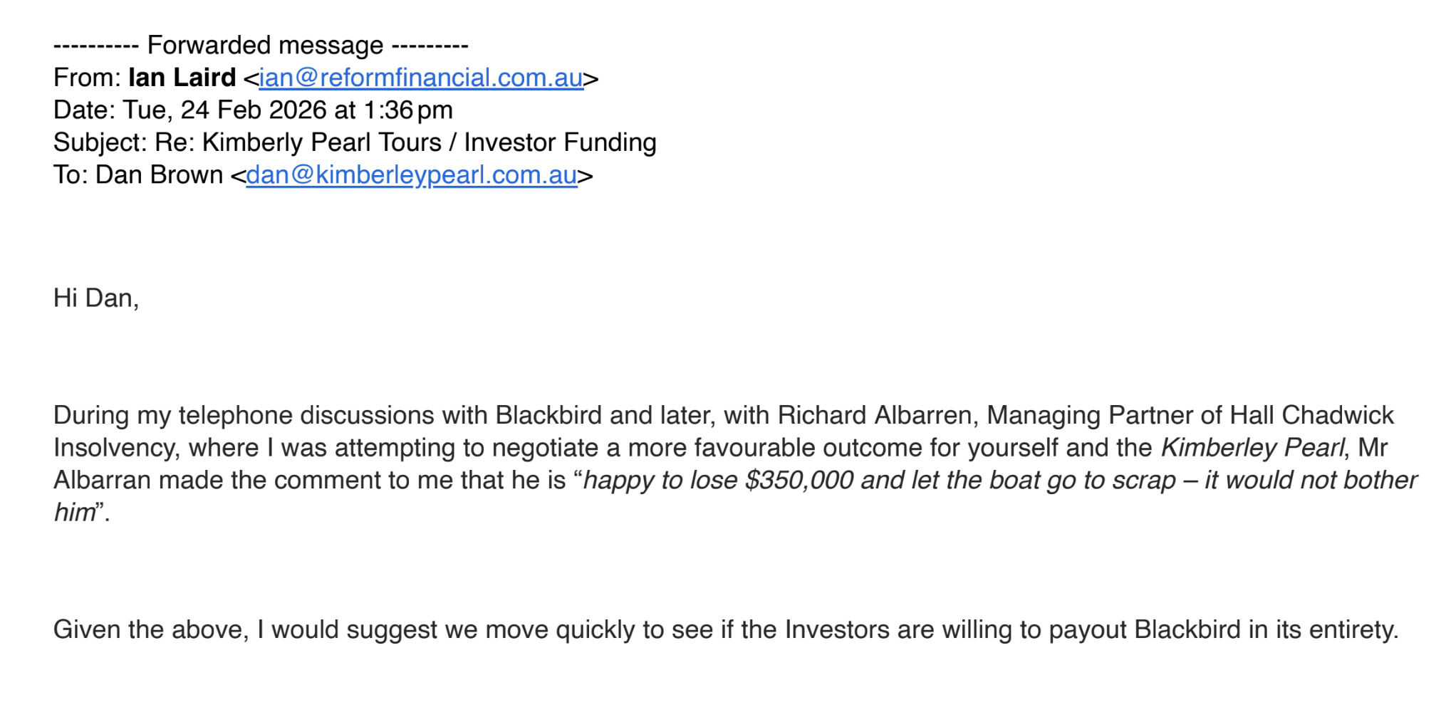“Happy to lose $350k and let the boat go to scrap”, says the email from liquidator Hall Chadwick’s associates to Kimberley Pearl Tours.